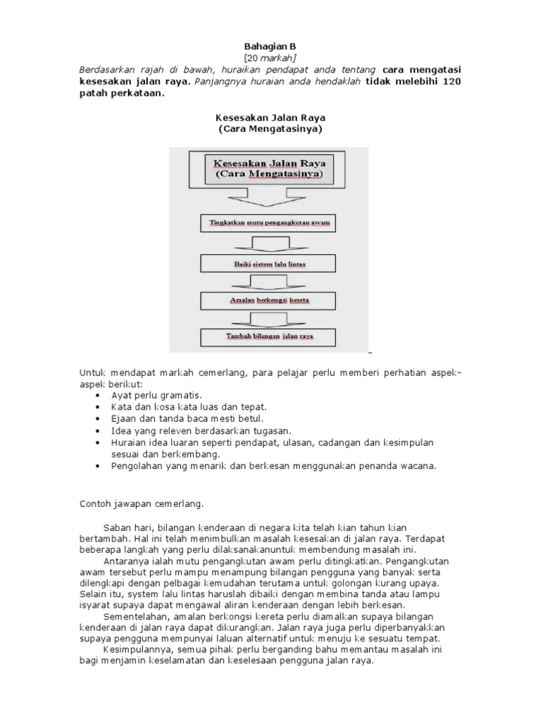 Kebanyakan kesesakan yang berlaku di jalan raya atau lebuh raya adalah akibat daripada kemalangan pengguna jalan raya. Pembangunan yang terancang dalam membangunkan sebuah bandar adalah sangat penting. Spm > bahasa melayu > karangan contoh bm kertas 1. Adalah menjadi harapan saya agar rakyat malaysia akan sentiasa beringat dan berwaspada semasa dalam perjalanan pulang ke kampung halaman. Situasi pertama katanya, dia tidak sempat menggosok pakaian anaknya pada sebelah malam kerana lewat sampai ke rumah disebabkan terpaksa mengharungi kesesakan lalu lintas jalan raya.